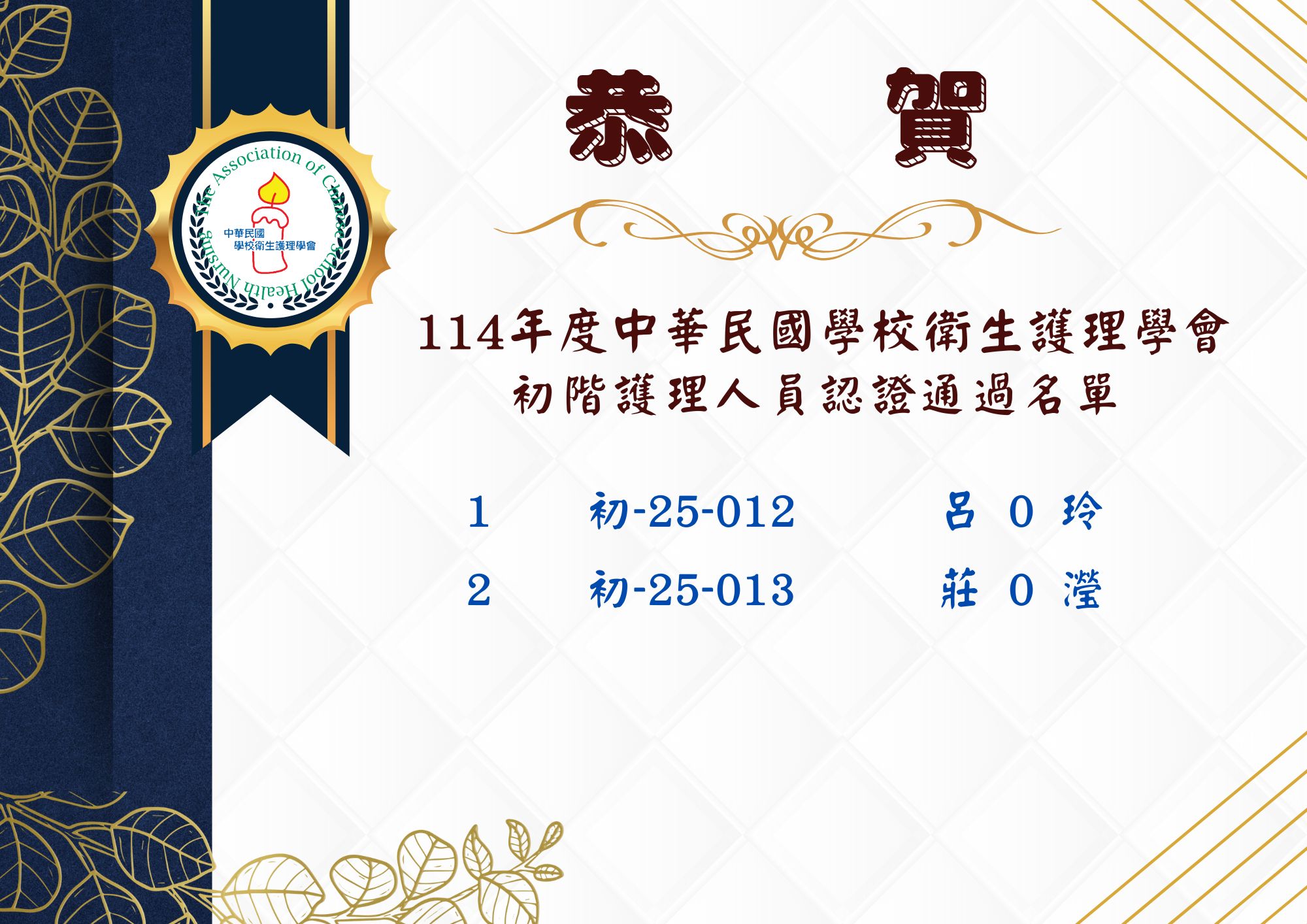 114年度中華民鶻學校務生護理學會 初階學校護理人員認證通過名單